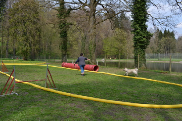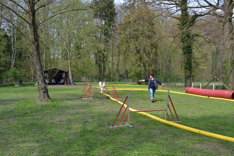 Longieren Diese Methode ist effektiv um die Bindung zwischen Mensch und Hund zu stärken, über Distanz zu führen, zu lenken und gleichzeitig in Bewegung Stress abzubauen.In einem großen Zirkel mit max. 20 m Durchmesser, abgetrennt durch eine sichtbare Barriere, die der Hund nicht übertreten darf. Der Mensch steht im Kreis, der Hund läuft außen. Dieses du darfst nicht zu mir, erstaunt die meisten Hunde so sehr, dass sie sich nach kurzer Zeit sehr gut auf die Signale ihres Menschen konzentrieren können. Beim Longieren sind der Fantasie keine Grenzen gesetzt, z.B. mit Tricks, Apportierspielen, sowie mit Hürden, Tunnel und Wippe.Der Mensch lernt mit Körpersprache und Handsignalen den Hund präzise anzuleiten und die Bindung zwischen Mensch und Hund perfekt aufzubauen | ![]() |